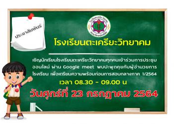 วันที่ 23 กรกฎาคม 2564 นางสาวชุฏิมา อินทร์จันทร์ ผู้อำนวยการโรงเรียนตะเครียะวิทยาคม เป็นประธานในการประชุมนักเรียน เพื่อแจ้งรายละเอียดในการเตรียมตัวสอบกลางภาค ภาคเรียนที่ 1/2564 ในวันที่ 2-6 สิงหาคม 2564 โดยจะมีการสอบกลางภาคผ่านระบบ Online และกิจกรรมต่างๆของโรงเรียนที่กำลังจะจัดขึ้น ในการประชุมครั้งนี้ โรงเรียนตะเครียะวิทยาคม ใช้การประชุมในรูปแบบ Google Meet โดยมีคณะครูและนักเรียนให้ความร่วมมือเป็นอย่างดี โดยนับจากจำนวนผู้เข้าร่วมประชุม 98 คน